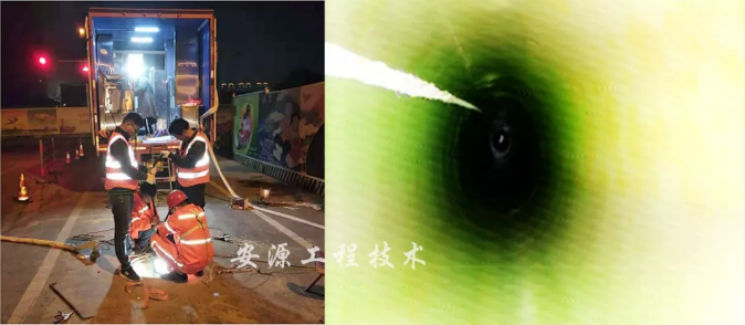 針對本段管段無法開挖、修復施工難度較大的特點,鄭州安源工程分別采用了“高聚物注漿”和“UV-CIPP”兩種非開挖修復技術,對該污水管道進行修復。